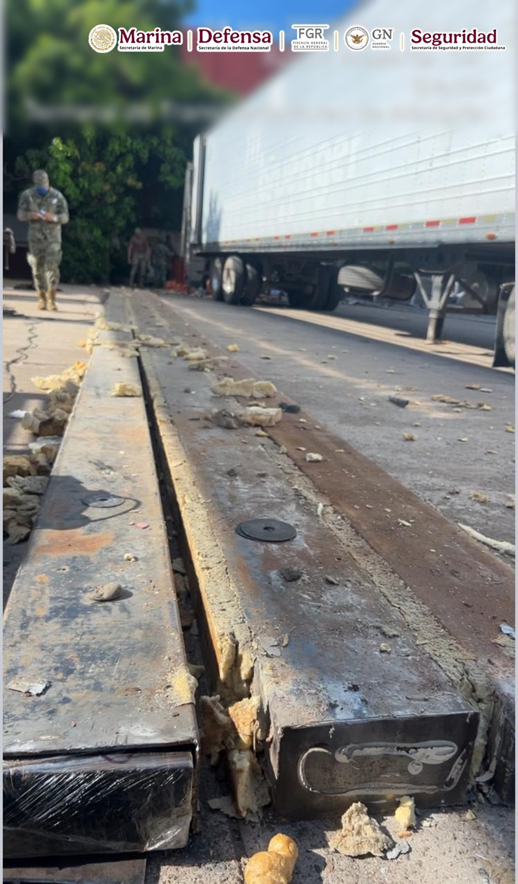 Mazatlán, Sinaloa, 15 de septiembre de 2025.- Elementos de la Secretaría de Marina (Semar), en coordinación con la Secretaría de la Defensa Nacional (Sedena), Guardia Nacional (GN), Secretaría de Seguridad y Protección Ciudadana (SSPC) y la Fiscalía General de la República (FGR), aseguraron un tractocamión en la terminal de Transbordadores del puerto de Mazatlán que transportaba 1.5 toneladas de metanfetamina ocultas en un doble fondo.