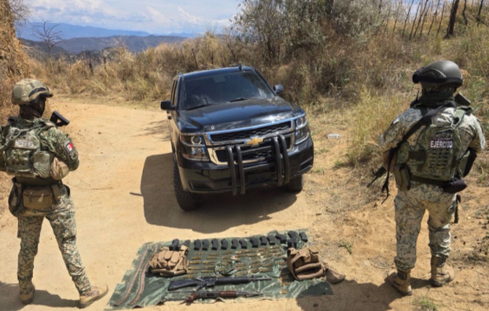 Aseguran camioneta robada con armas, municiones y equipo táctico en su interior, en Tameapa, Badiraguato