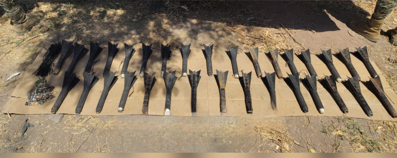 Navolato, Sinaloa. – Autoridades aseguraron vehículos, armas, municiones, artefactos explosivos y presunta droga.