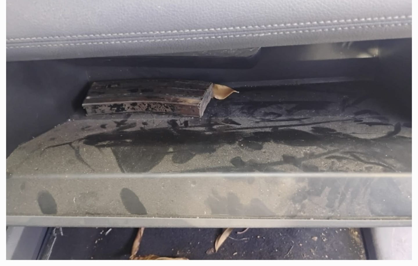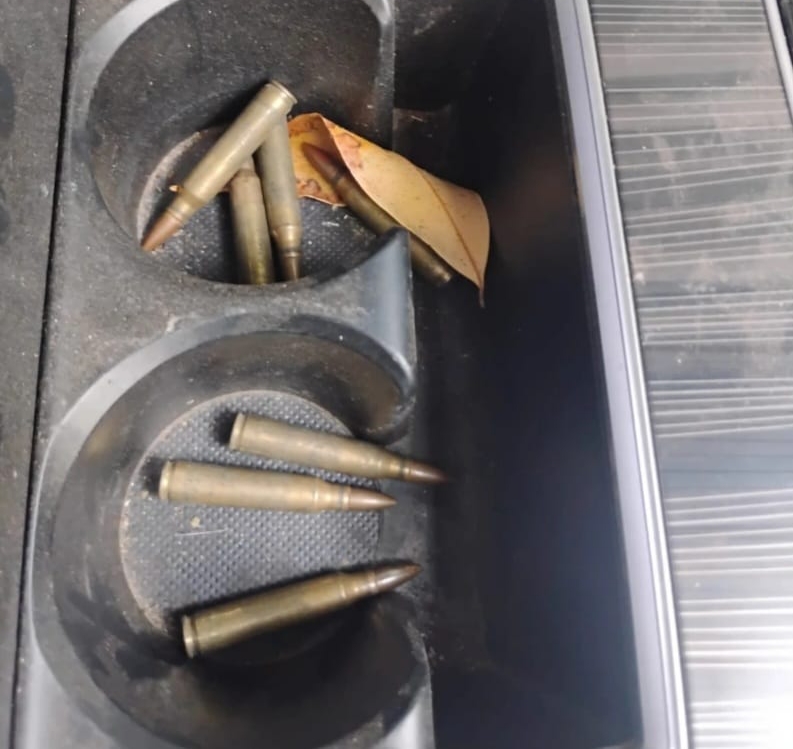 Al inspeccionar el vehículo, se localizó en el interior un cargador abastecido con 23 cartuchos calibre 5.56 x 45 mm, además de otros 7 cartuchos útiles del mismo calibre y 10 puntas de acero; asimismo, en las inmediaciones del vehículo se encontraban 10 máquinas tragamonedas.