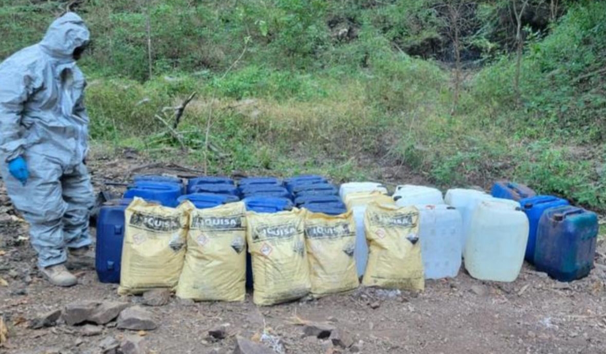 Al efectuar reconocimientos terrestres a pie y motorizados en los mencionados municipios, el personal militar localizó las áreas de almacenamiento de precursores y materiales para la elaboración de drogas sintéticas, que contenían lo siguiente: