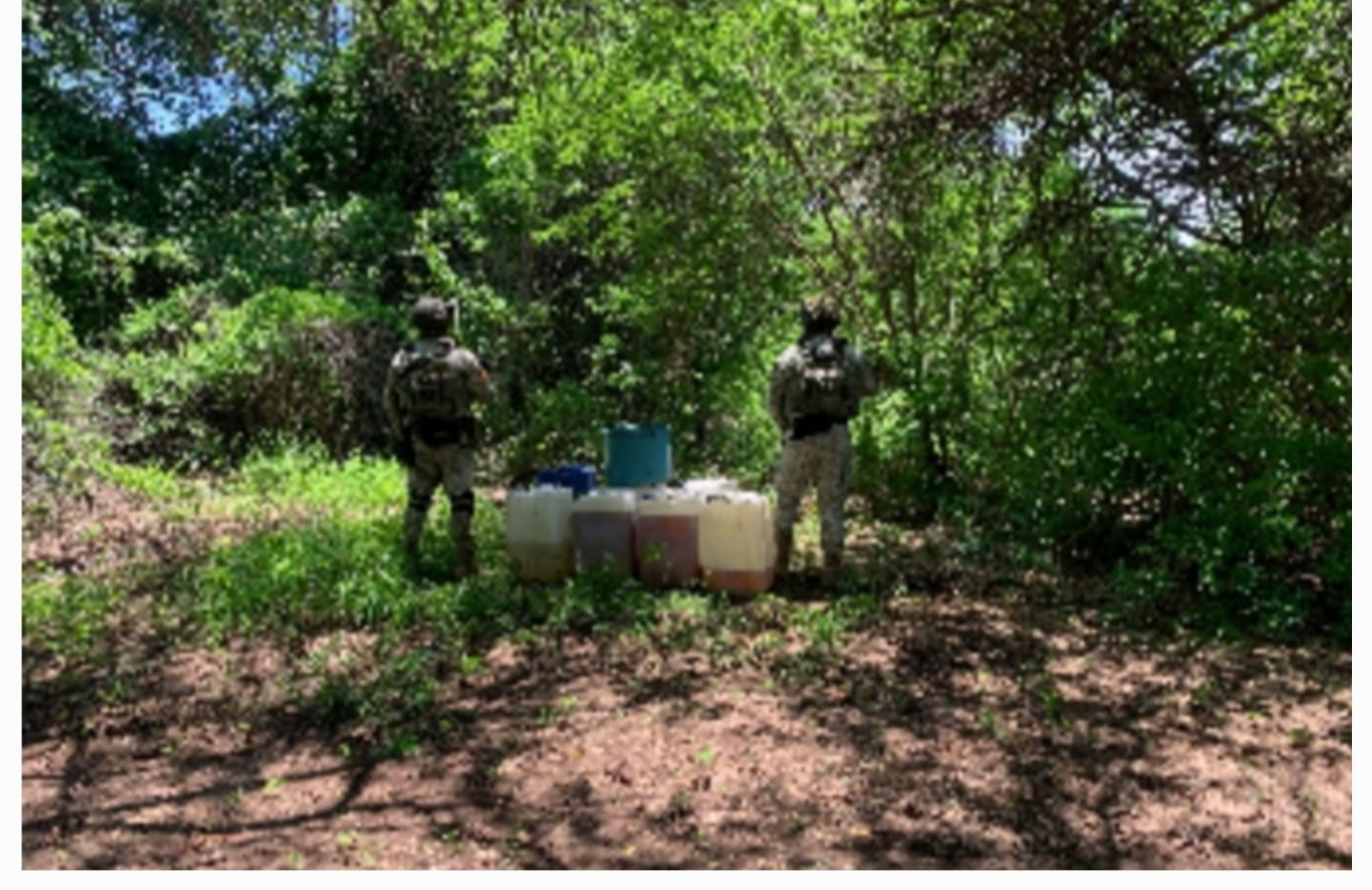 El personal militar localizó las áreas de almacenamiento de sustancias químicas para la elaboración de drogas sintéticas. En el lugar se encontró lo siguiente: