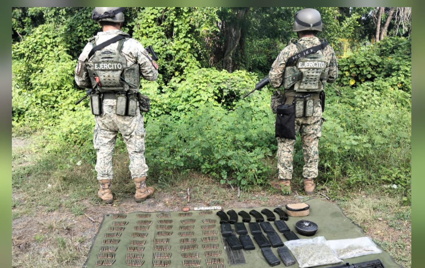 Durante trabajos de reconocimiento terrestre en las inmediaciones del poblado Jotagua, en el municipio de Culiacán, el personal militar observó a un civil que, al notar su presencia, se perdió entre la maleza. Al implementar un despliegue en la zona, los efectivos localizaron lo siguiente: