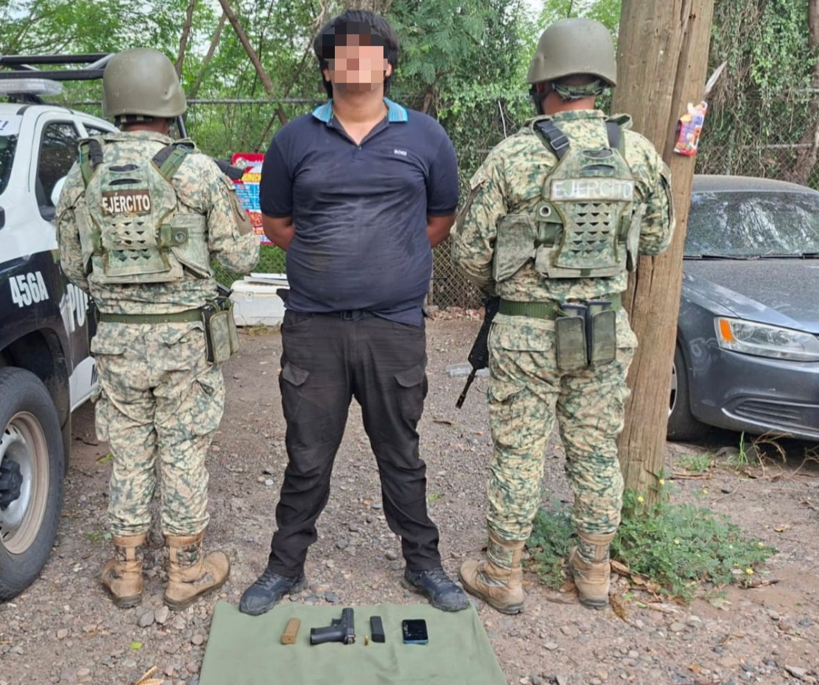 Al realizar reconocimientos terrestres en la avenida Revolución, entre la calle Amado Nervo y la calle Mario Escobedo, en la colonia Miguel Hidalgo, el personal militar detuvo a un civil en posesión de un arma, dos cargadores y un celular.