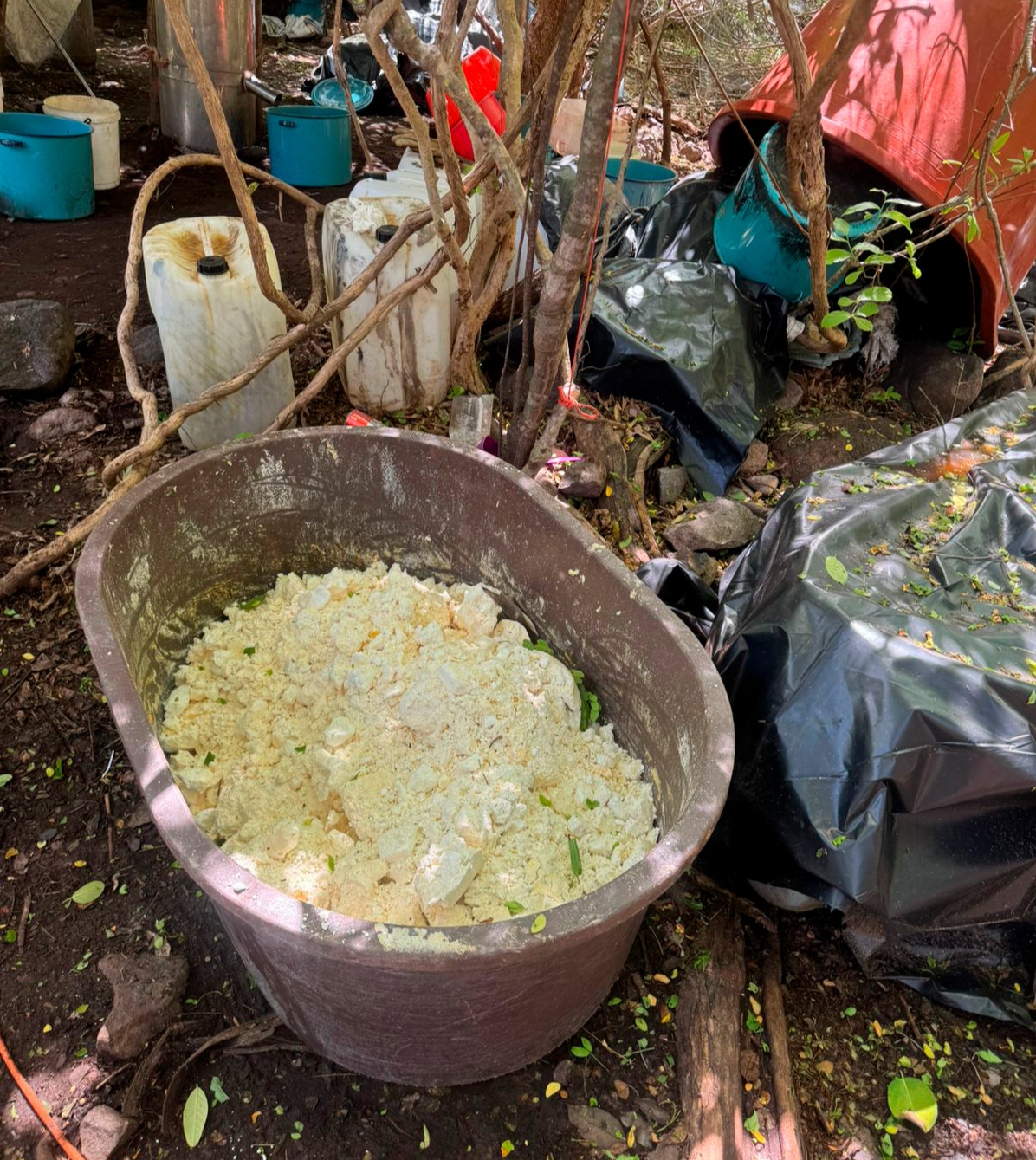 Los efectivos, al realizar recorridos terrestres, localizaron un laboratorio de aproximadamente 80 por 30 metros, en el cual aseguraron 950 kilogramos de metanfetamina, 1,600 litros de precursores químicos líquidos y 1,625 kilogramos de precursores químicos sólidos, así como material diverso, con los cuales se pudo llegar a producir hasta 245 kilos de metanfetamina.