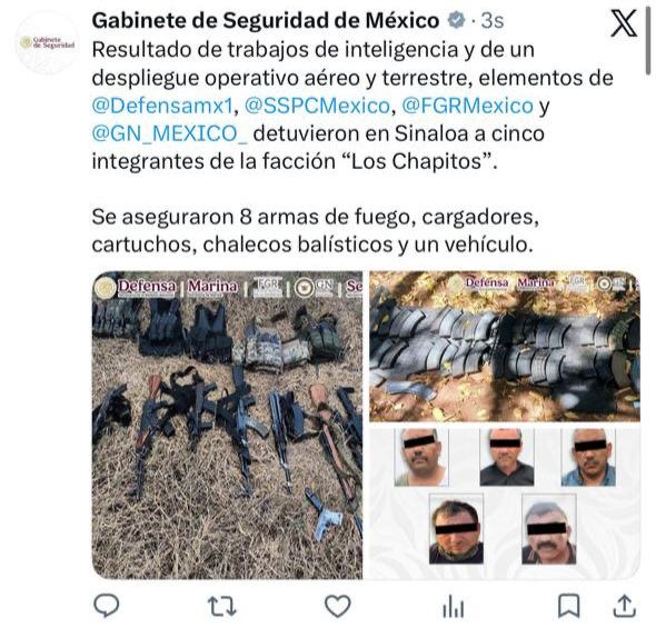 Ciudad de México, 16 de abril de 2026.- Como parte del reforzamiento permanente de seguridad en el estado de Sinaloa, elementos de la Secretaría de la Defensa Nacional (Defensa), Secretaría de Seguridad y Protección Ciudadana (SSPC), Fiscalía General de la República (FGR) y Guardia Nacional (GN) detuvieron a cinco hombres vinculados a un grupo delictivo que opera en la región y aseguraron armas de fuego, cargadores y un vehículo.