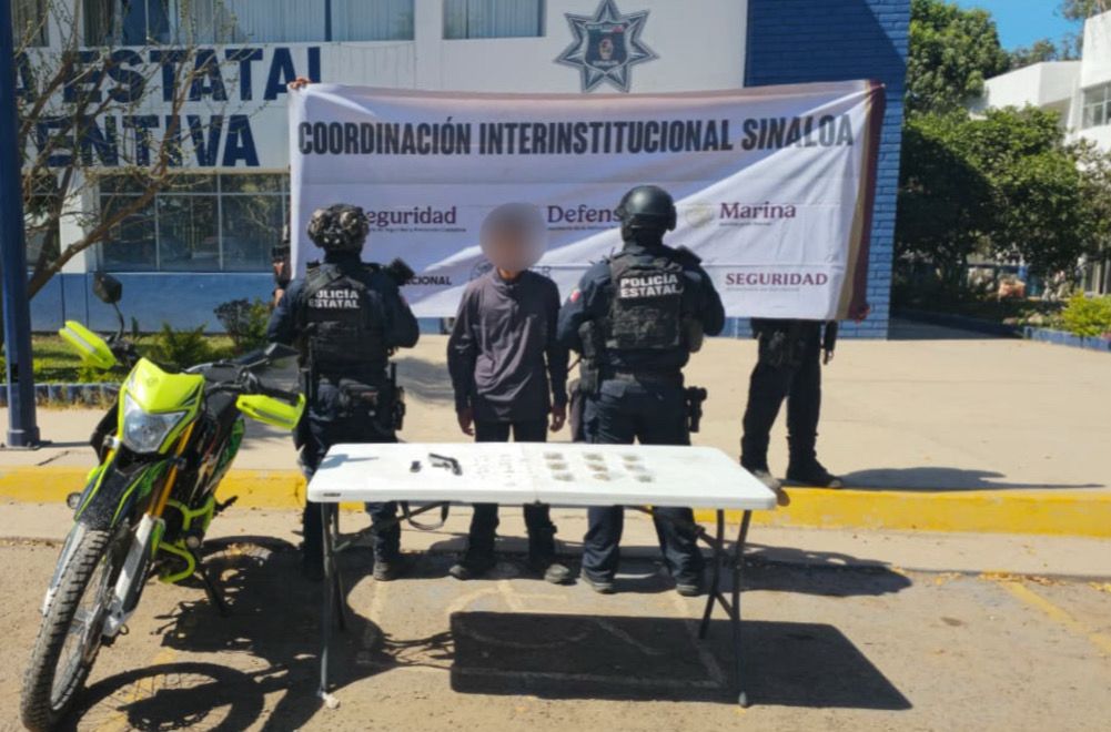 Culiacán, Sinaloa. – Elementos de la Secretaría de Seguridad Pública de Sinaloa, detuvieron en Culiacán a un menor de edad, a quien se le aseguró un arma corta, droga y una motocicleta robada.
