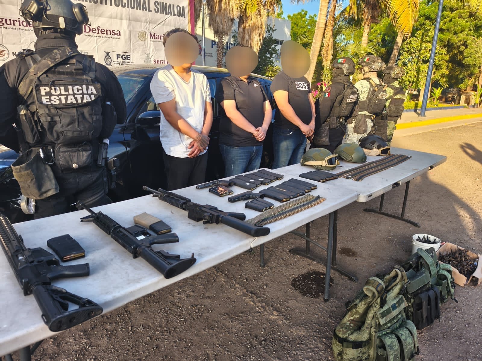 Posteriormente, como parte del operativo de localización de los demás involucrados, elementos del Grupo de Operaciones Especiales Sinaloa (GOES) lograron ubicar a tres civiles armados en el fraccionamiento Málaga Residencial. En el sitio se aseguraron cinco armas de fuego y un vehículo, y los detenidos fueron puestos a disposición de las autoridades correspondientes.