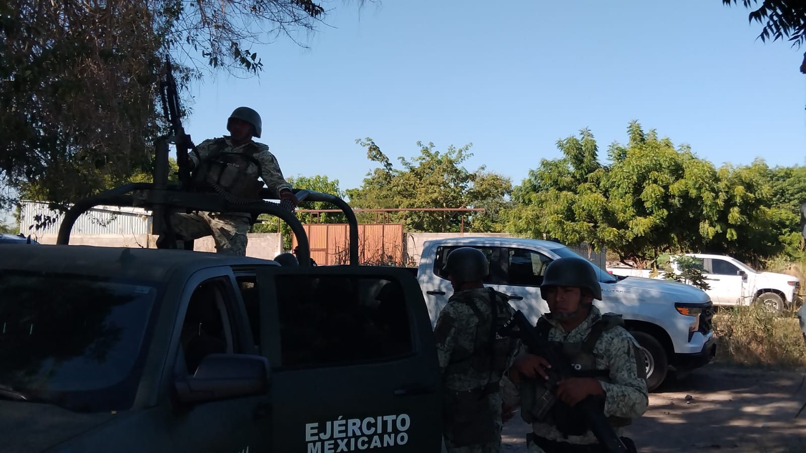 Dos vehículos aseguran elementos de la FGR y militares durante el cateo a un campestre en Bellavista, Culiacán