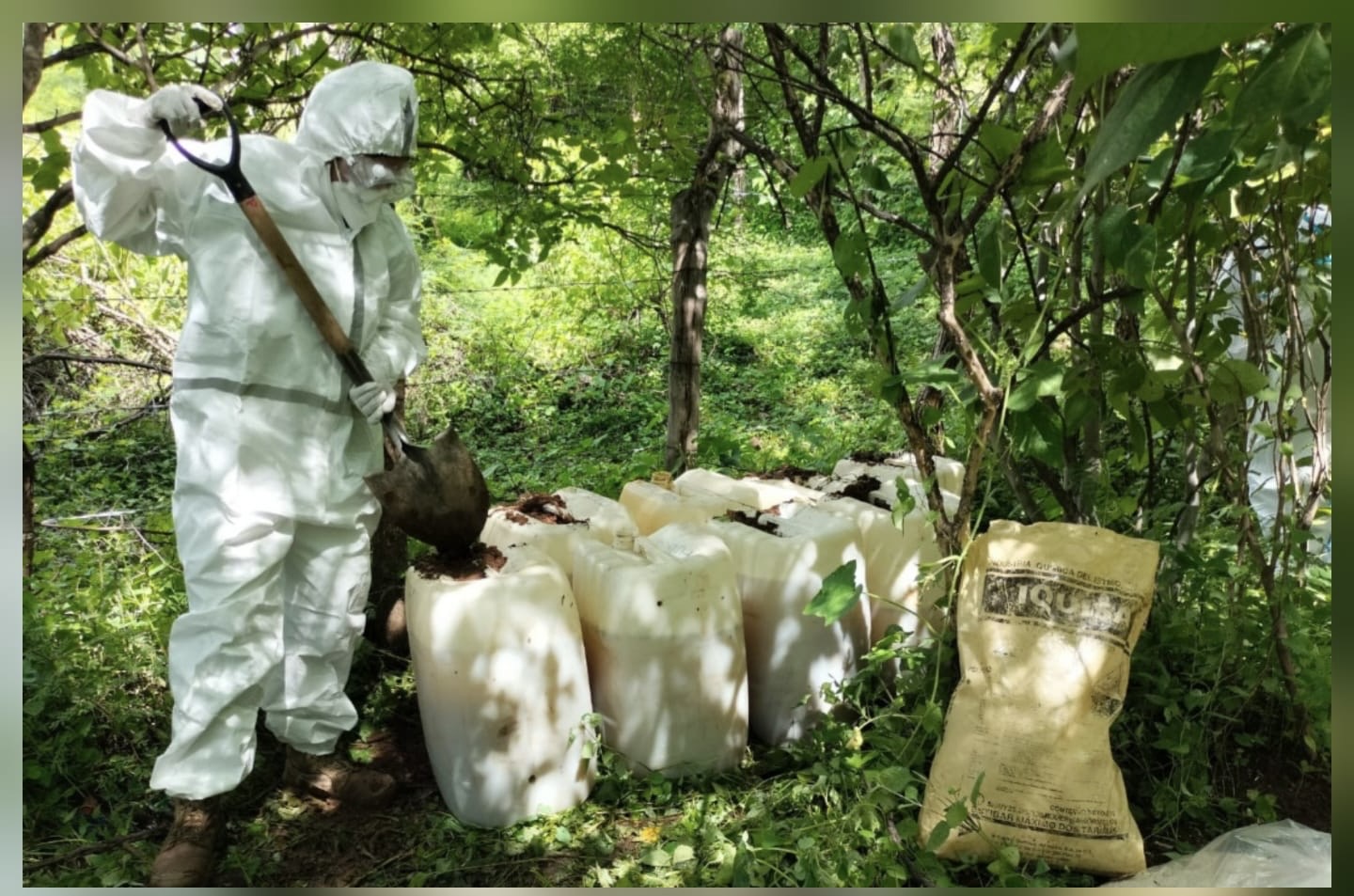 A través de trabajos de reconocimiento terrestre, en el marco de la “Operación Búsqueda, Localización y Destrucción de Laboratorios Clandestinos”, el personal localizó dos áreas de concentración de materiales químicos utilizados para la elaboración de drogas sintéticas en las comunidades de Walamito y San Cayetano, en la capital sinaloense. En estos puntos se localizaron y aseguraron lo siguiente: