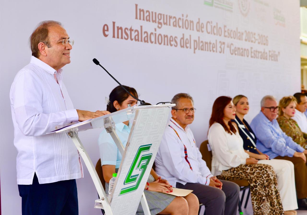 Particularmente, agradeció el apoyo de Gobierno del Estado por la rehabilitación del Plantel 37 “Genaro Estrada Félix”, en el cual se invirtieron más de 18 millones de pesos, que beneficia a 550 estudiantes de este sector de la ciudad, quienes podrán disfrutar de las nuevas instalaciones diseñadas para potenciar un aprendizaje accesible y adaptado a los desafíos de la educación actual.