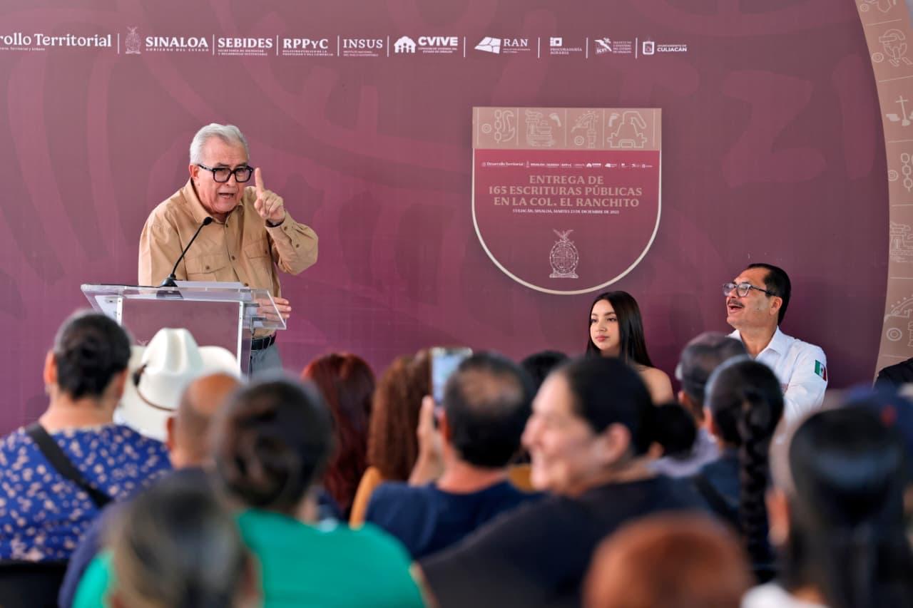 Culiacán, Sinaloa, 23 de diciembre de 2025.- En un acto de justicia social, el gobernador Rubén Rocha Moya, acompañado por la secretaria de Desarrollo Agrario, Territorial y Urbano, Edna Elena Vega Rangel; y por el director del Instituto Nacional del Suelo Sustentable (INSUS), Víctor Rubén Guzmán Dagnino, entregó 164 títulos de propiedad a igual número de familias de El Ranchito, al sur de Culiacán, con lo que les otorgó la certeza jurídica de que sus viviendas ya son consideradas su legítimo patrimonio.