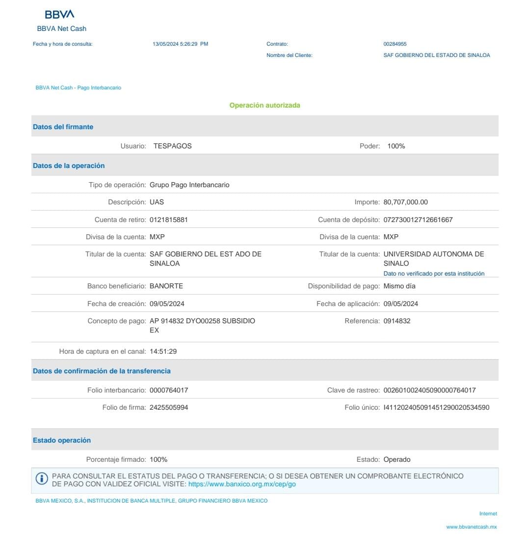Gobierno de Rocha realiza nuevo depósito para que la UAS cubra sus adeudos ante el SAT