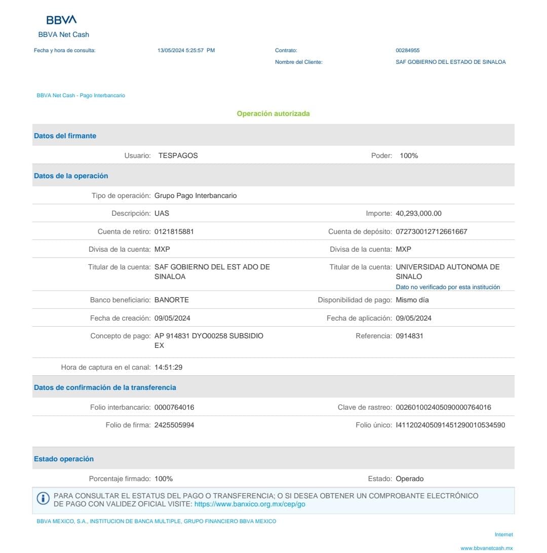 Gobierno de Rocha realiza nuevo depósito para que la UAS cubra sus adeudos ante el SAT