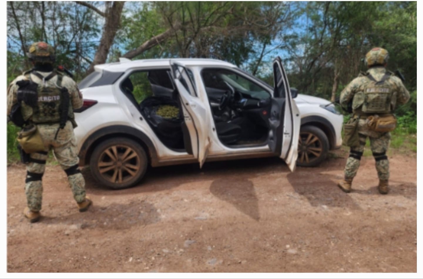 Durante reconocimientos terrestres en el poblado El Carrizal, los elementos militares localizaron una camioneta tipo SUV con las puertas abiertas. Al acercarse y cotejar la información de la unidad, se corroboró que contaba con reporte de robo; asimismo, observaron que dentro de la unidad había una bolsa que contenía presunta marihuana, con un peso aproximado de 8.5 kilos.