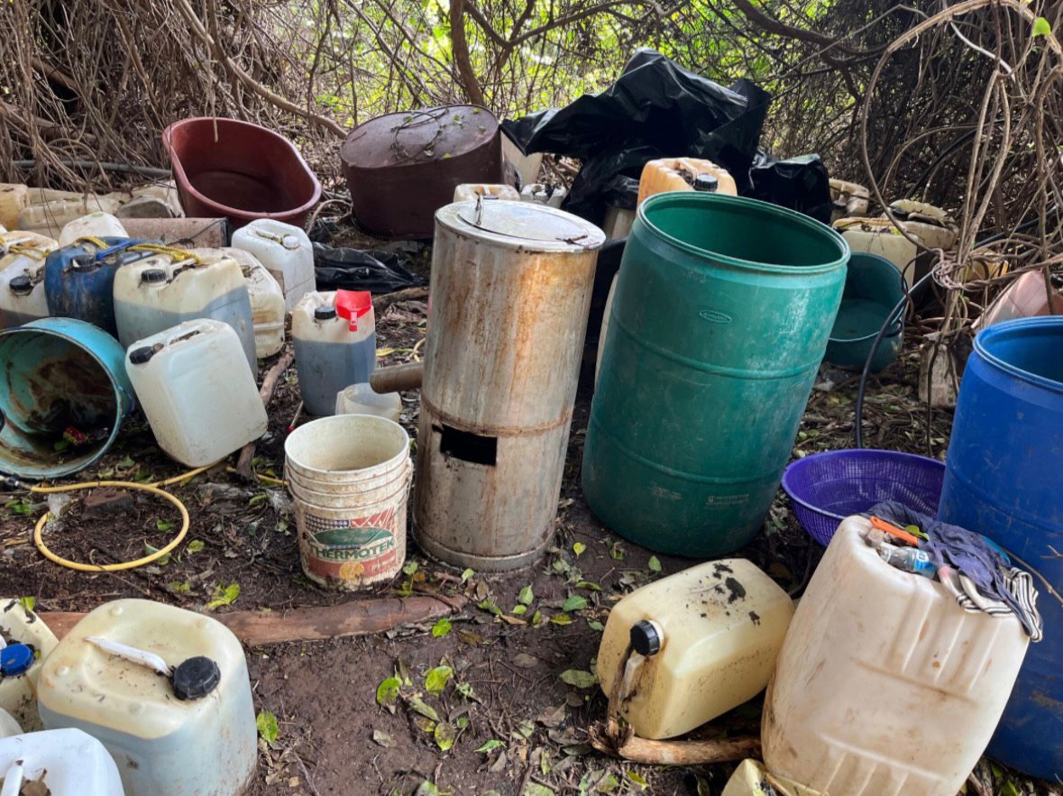 Elota, Sinaloa. – Autoridades aseguraron y destruyeron áreas de almacenamiento de precursores químicos y utensilios para la elaboración de drogas en Culiacán, Mocorito y Elota.