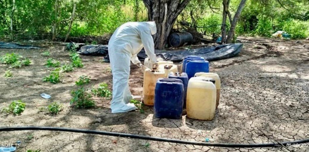 El personal militar que llevaba a cabo recorridos de reconocimiento en la zona rural del municipio localizó áreas de concentración en los poblados Higueras de Abuya y La Estancia de Los García, con los siguientes químicos y utensilios: