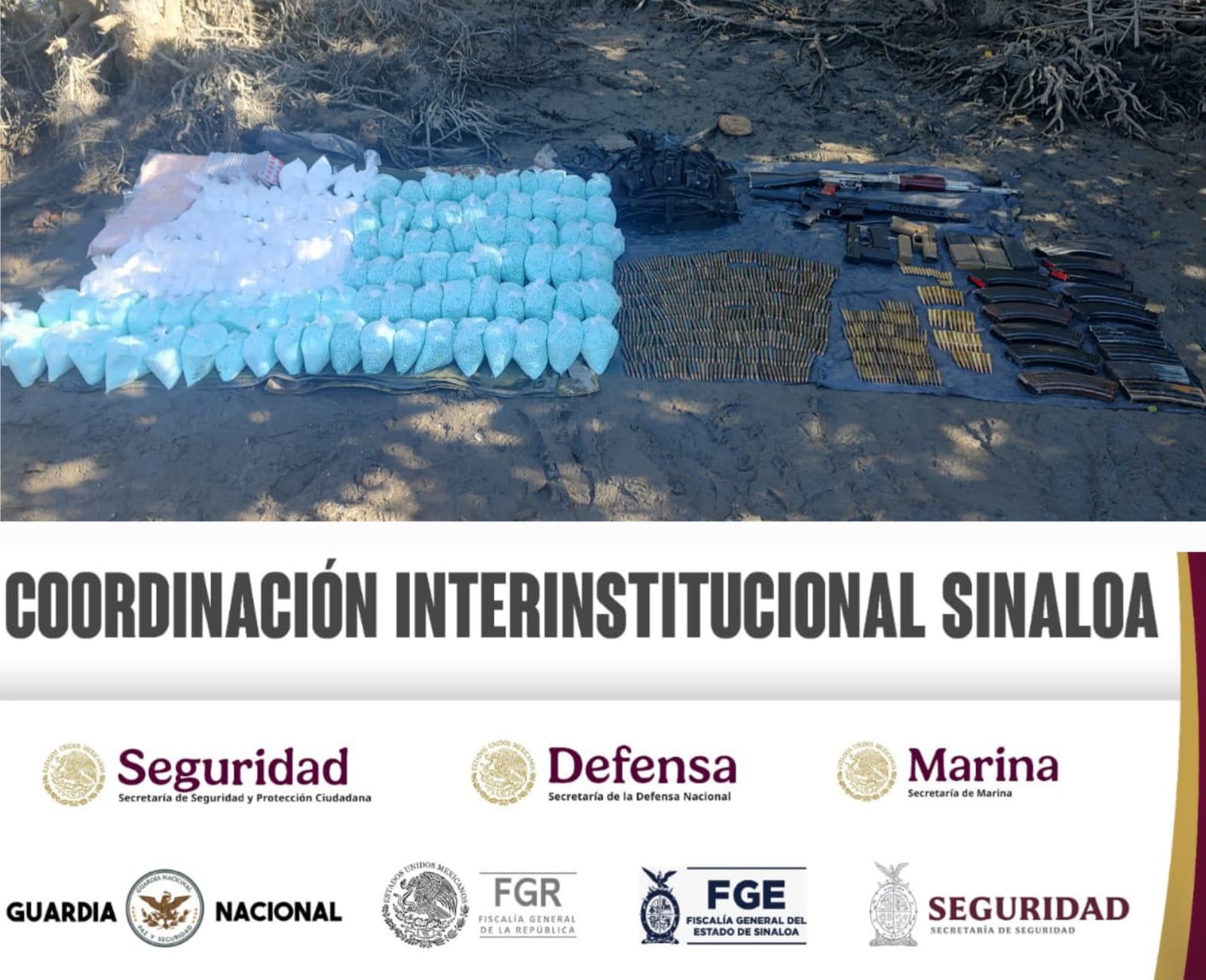 Militares localizan fentanilo, metanfetamina, armas y equipo táctico en Las Aguamitas, Navolato