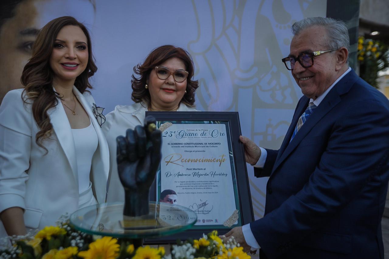 Mocorito, Sinaloa.- En sesión solemne del Ayuntamiento de Mocorito, realizada en el Hemiciclo al General Rafael Buelna Tenorio, el gobernador Rubén Rocha Moya entregó la presea Grano de Oro “Gral. Rafael Buelna Tenorio”, como un reconocimiento post mortem, al docente, académico e investigador de la Universidad Autónoma de Sinaloa, doctor Ambrocio Mojardín Heráldez, distinción que fue recibida por su esposa, la señora Mercedes López viuda de Mojardín, en compañía de sus hijos.