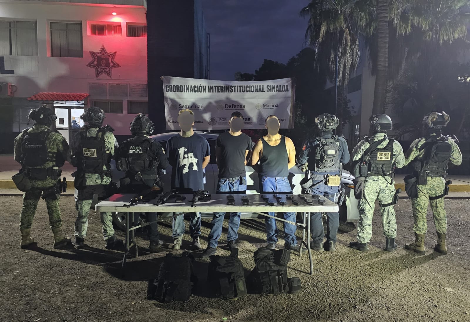 • Tras denuncia anónima detienen a tres hombres con armas, equipo táctico, ‘ponchallantas’ y un vehículo robado en Hacienda del Valle, Culiacán