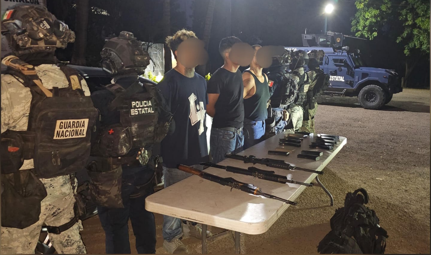 Tras denuncia anónima detienen a tres hombres con armas, equipo táctico, ‘ponchallantas’ y un vehículo robado en Hacienda del Valle, Culiacán